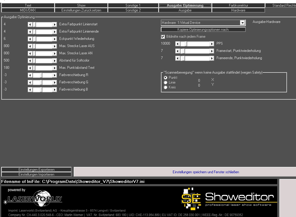 Die Normale Ausgabe vom Showeditor läuft über die Ausgabeoptimierung... daher darfst Du dann auch für 100% Scannwinkel (je nach Galvosystem 40-60 Grad) die Nenn-Scanngeschwindigkeit verwenden, weil die Interpolation eben längere Strecken (als 8 Grad) entsprechend unterteilt, und die Galvos somit nicht zu schnell werden.